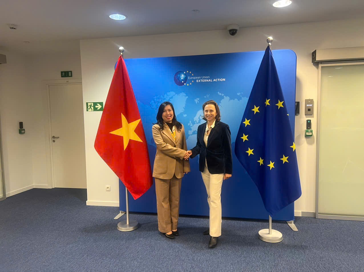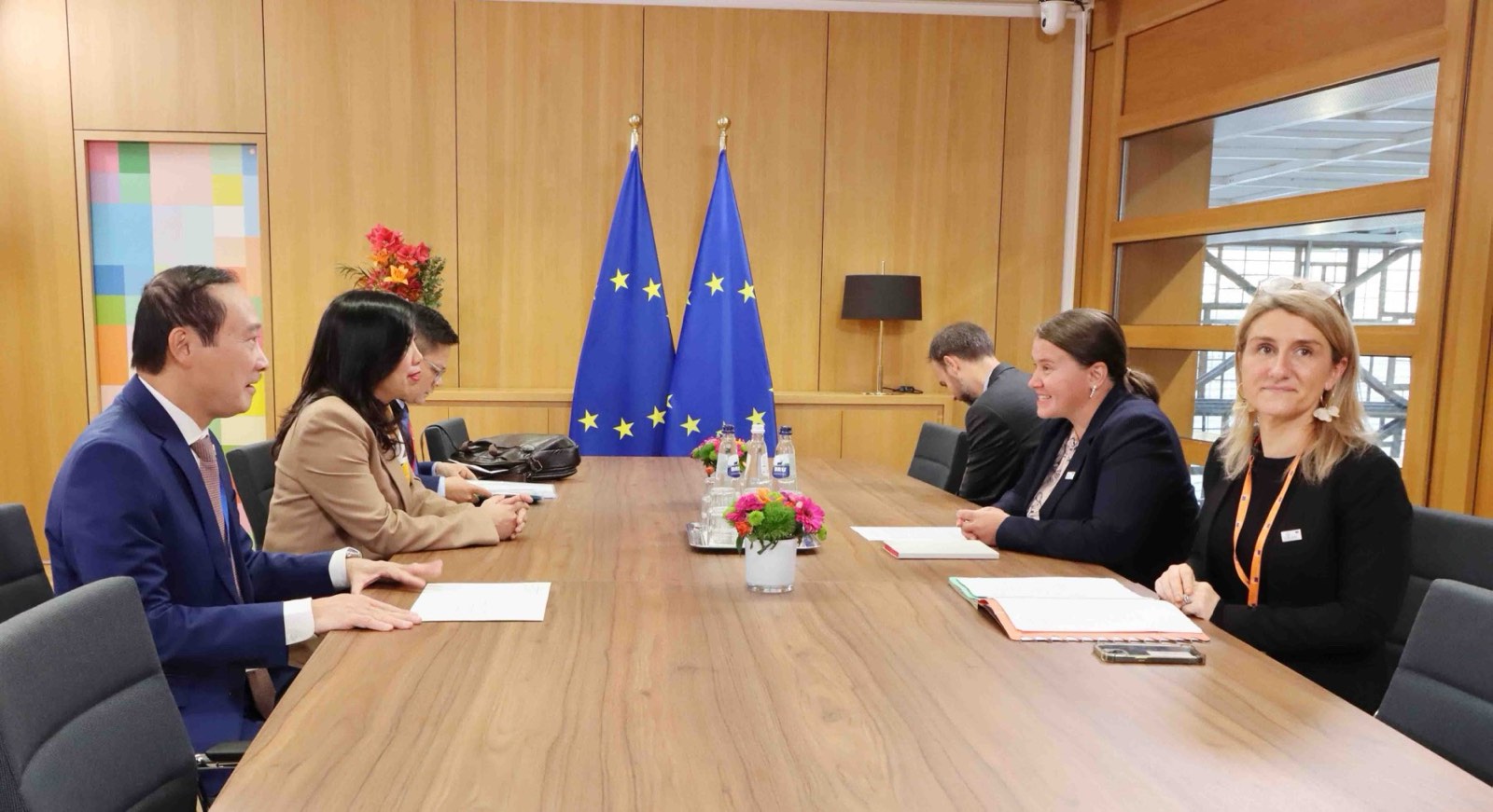 Bà Belen Martinez Carbonell, Tổng Thư ký Cơ quan đối ngoại EU và bà Veronika Musilova, Cố vấn đối ngoại của Chủ tịch Hội đồng châu Âu đánh giá cao những bước phát triển tích cực của quan hệ Việt Nam – EU sau 35 năm, khẳng định đã tới thời điểm hai bên đưa quan hệ song phương lên tầm cao mới; đề nghị hai bên phối hợp chặt chẽ chuẩn bị cho các hoạt động trao đổi đoàn cấp cao trong thời gian tới; nhất trí tăng cường hơn nữa tin cậy chính trị, tối đa hóa tiềm năng hợp tác thương mại – đầu tư, chuyển đổi số, chuyển đổi xanh, ứng phó với biến đổi khí hậu và đưa khoa học - công nghệ trở thành trụ cột hợp tác mới. Lãnh đạo EU khẳng định sẽ xem xét tích cực các đề nghị của Việt Nam liên quan đến EVIPA và IUU; sẵn sàng ủng hộ và hỗ trợ Việt Nam tham gia vào các cơ chế đa phương và khu vực như Liên hợp quốc và Tổ chức Hợp tác và Phát triển kinh tế (OECD)…